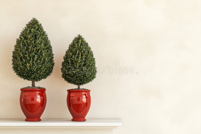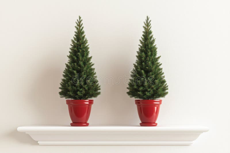 Conifers in Bright Red Ceramic Pots on a White Shelf Stock