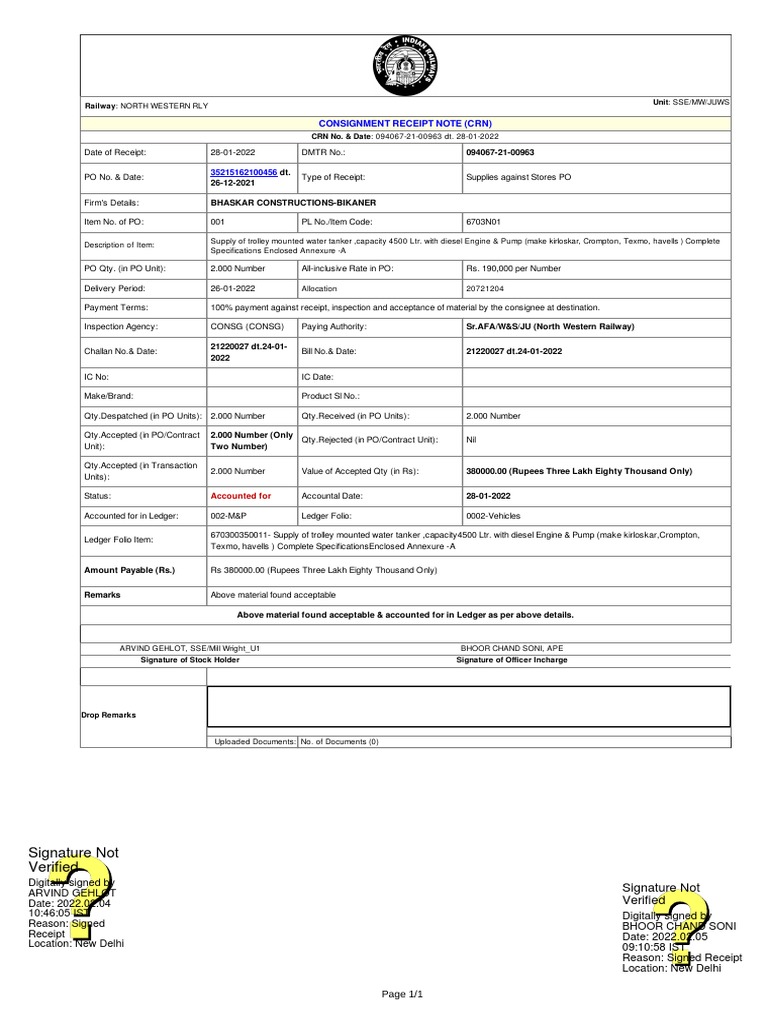 Signature Not Verified: Consignment Receipt Note (CRN) PDF