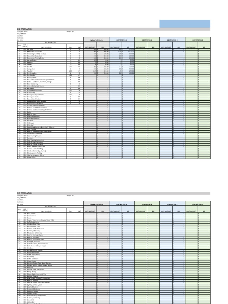 Bid Tabulation Detailed Contractor Pricing Excel Template