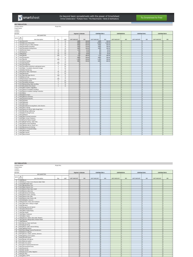 Free Construction Bid Templates Smartsheet