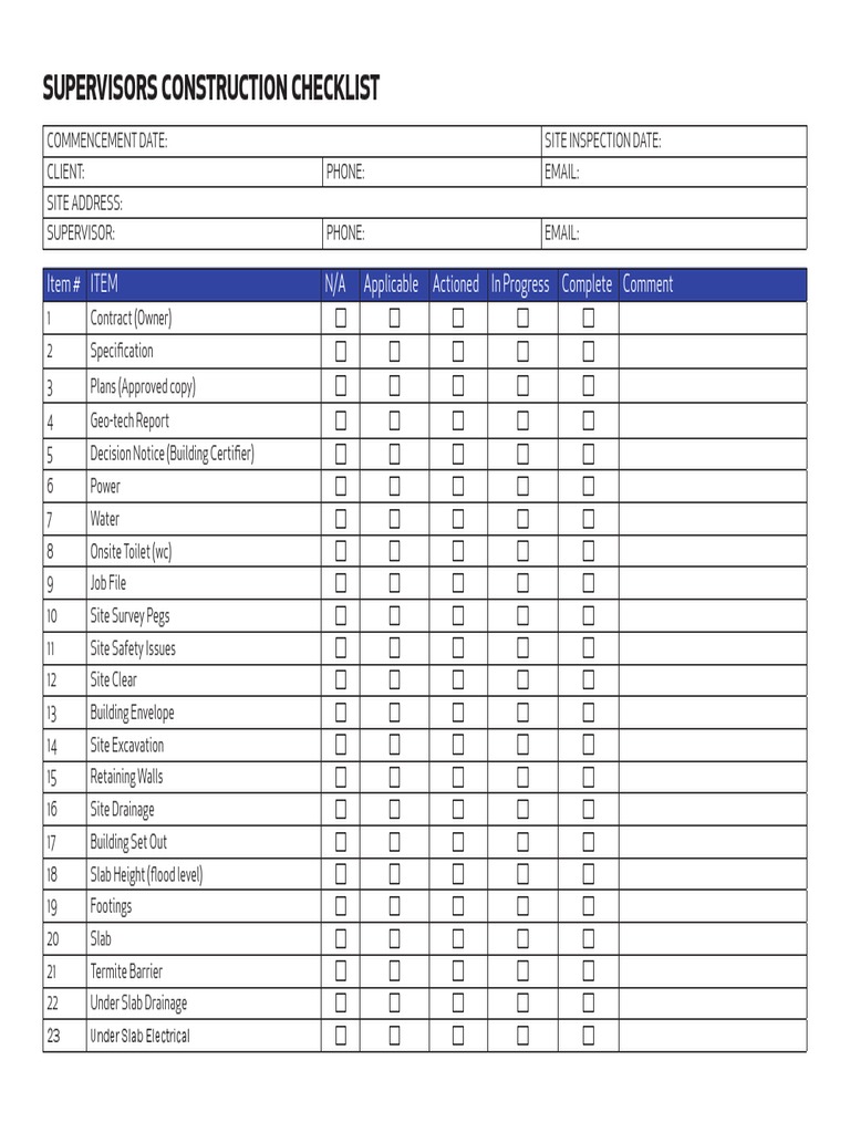 Supervisors Construction Checklist: Item # ITEM N/A Applicable Actioned