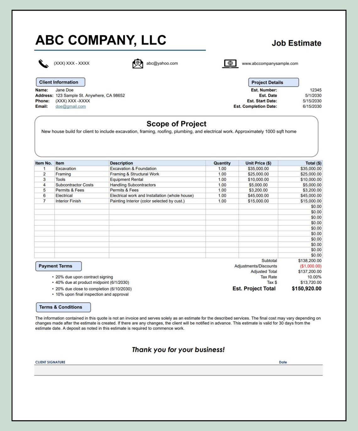 Job Estimate Template: Construction Contractor Proposal Bid (google