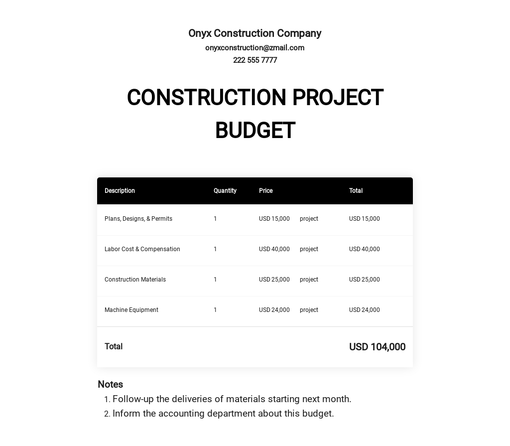 Construction Project Budget Template