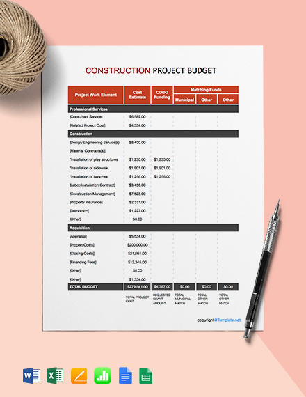 Construction Project Budget Template in Google Docs Word Excel Pages
