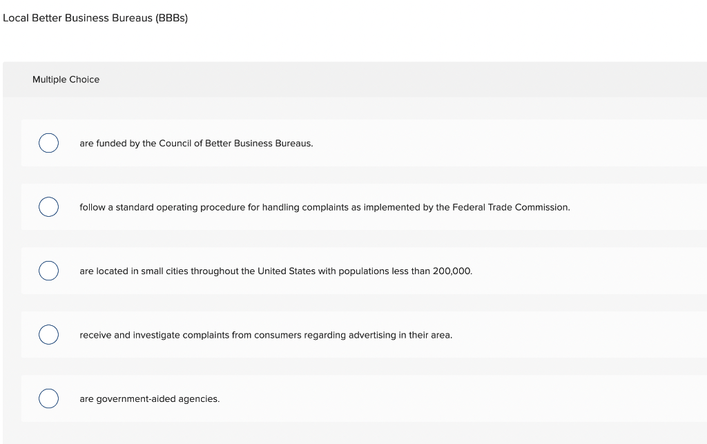 Solved Local Better Business Bureaus (BBBs) Multiple Choice Chegg com