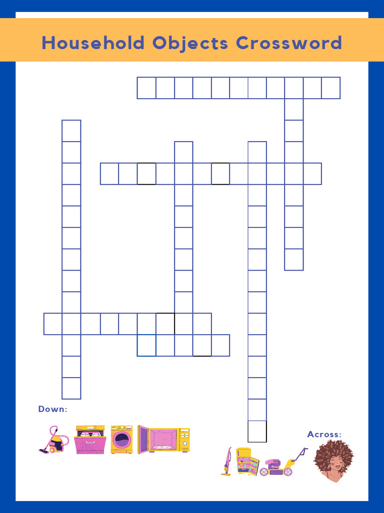 Purple Yellow English Household Objects Crossword Puzzle Worksheet PDF