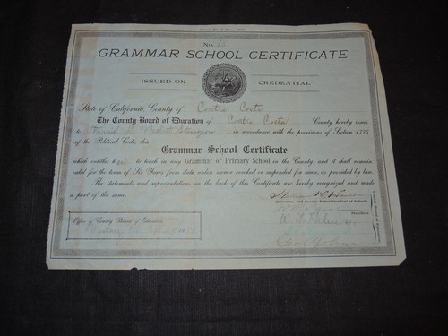 1917 Grammar School Teacher Certificate Contra Costa CA Fanniel Nesbit
