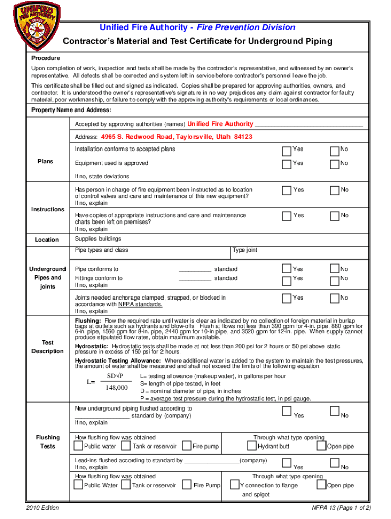 Nfpa 13 Above Ground Test Certificate Fill Online Printable