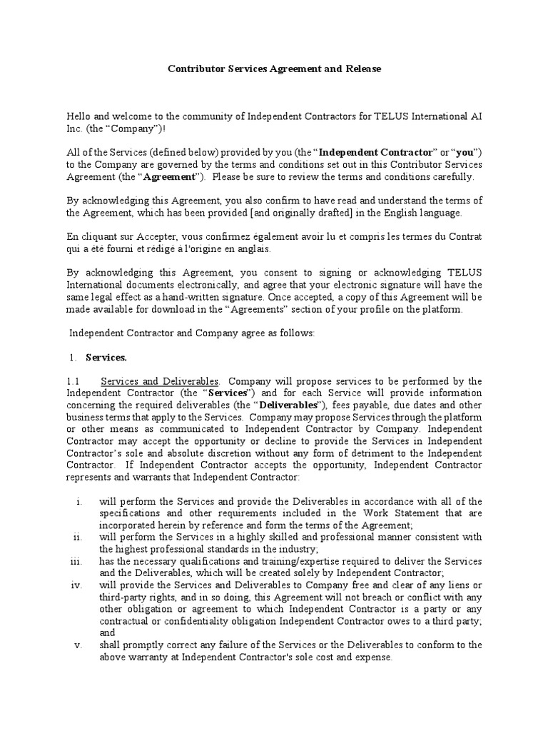Comprehensive Template For Contributor Services Agreement Telus