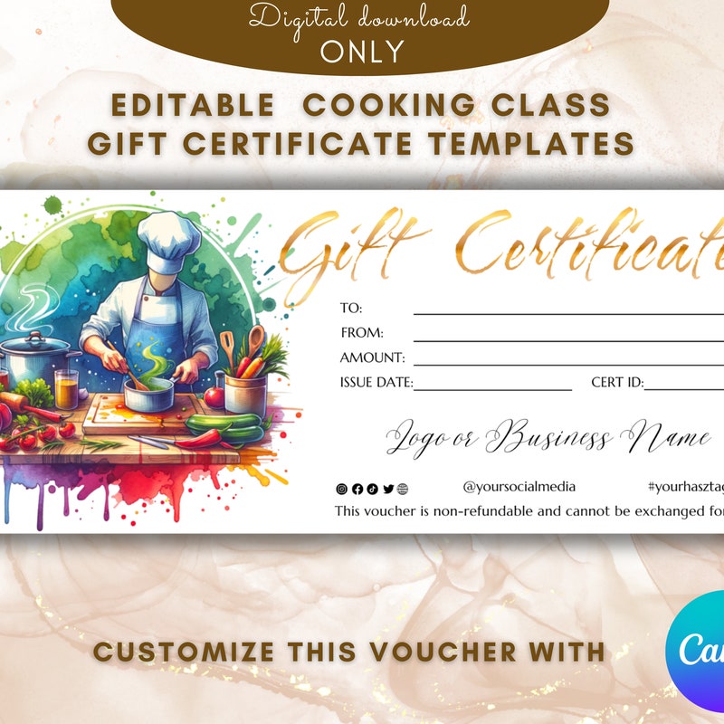 Cooking Class Gift Certificate Template Gift for Foodie Voucher