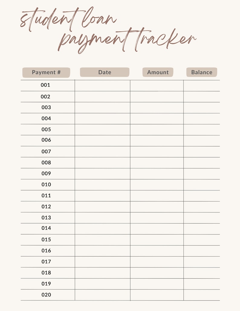 PRINTABLE Student Loan Payment Tracker Template Worksheet Workbook