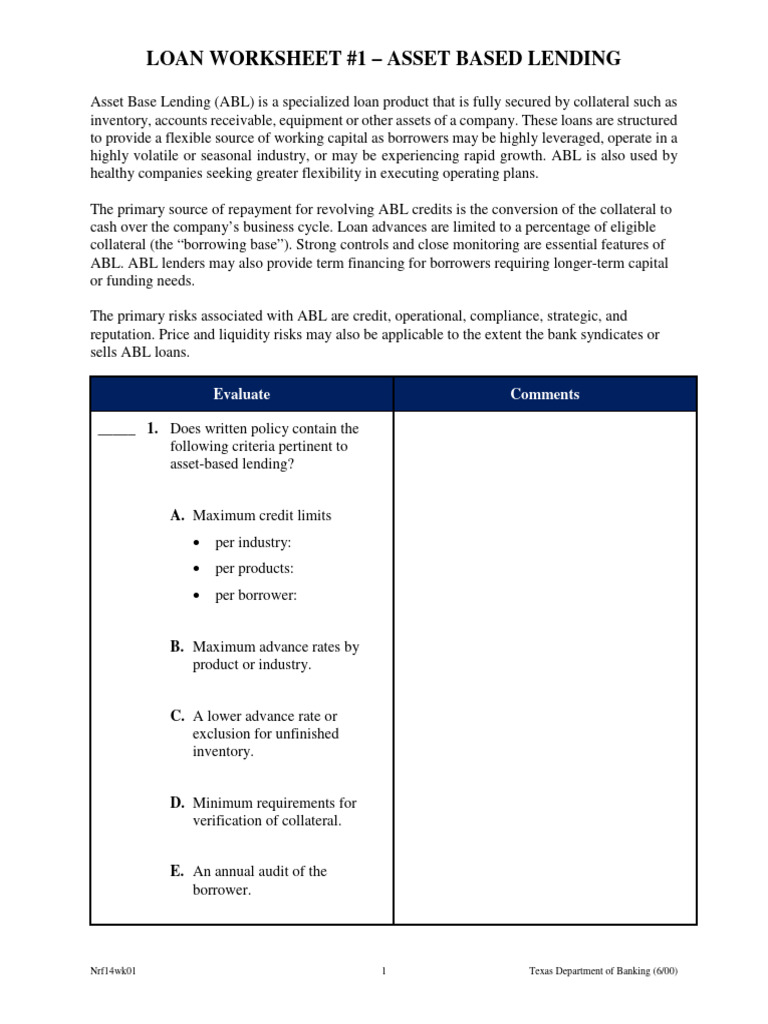 ABL Loan Worksheet Download Free PDF Loans Finance Money Management