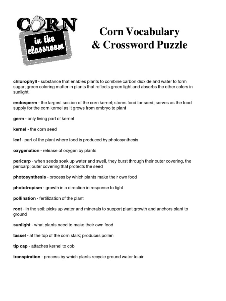 Corn Vocabulary Crossword Puzzle Download Free PDF Seed Plants