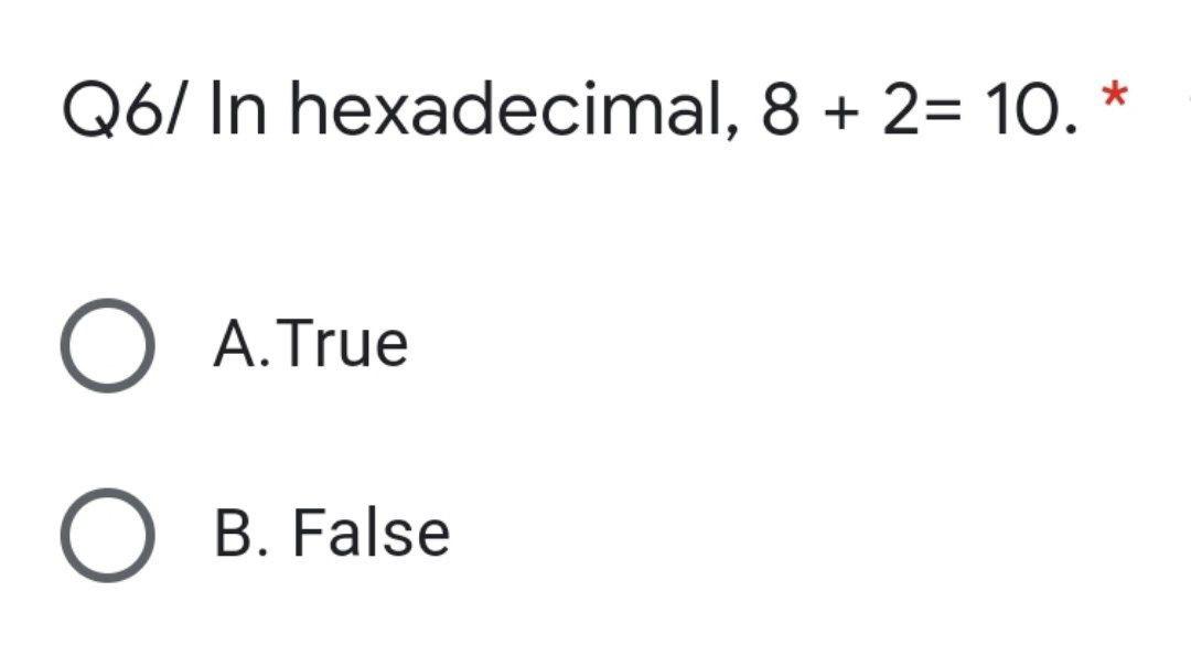 Solved Q6/ In hexadecimal 8 2= 10 * O A True O B False Chegg com
