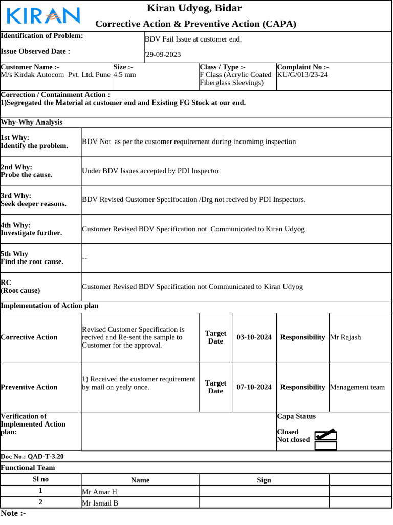 Corrective And Preventive Action Plan Template