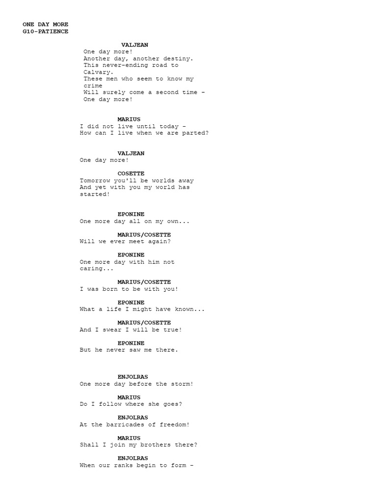 One Day More Lyrics PDF Cosette Marius Pontmercy