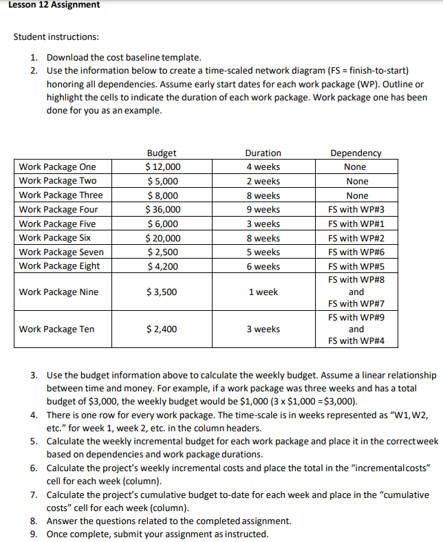 Student instructions: 1 Download the cost baseline Chegg com