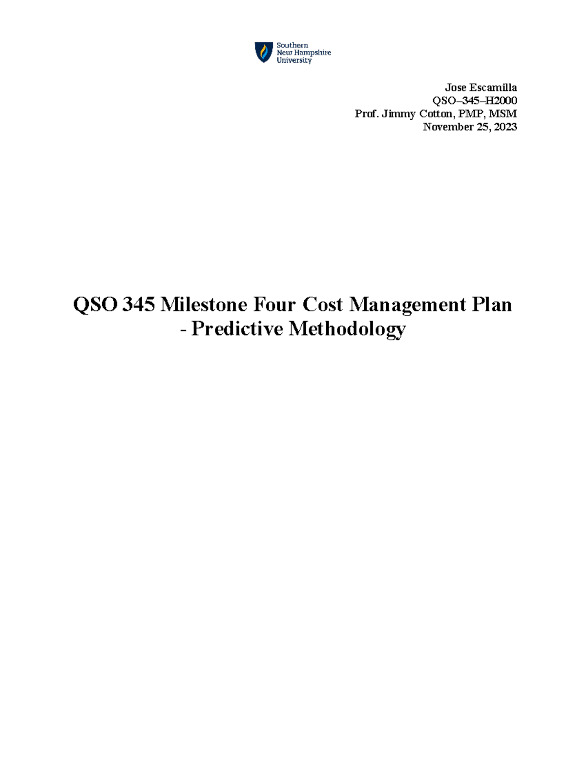 QSO 345 Milestone Four Cost Management Plan Template Predictive
