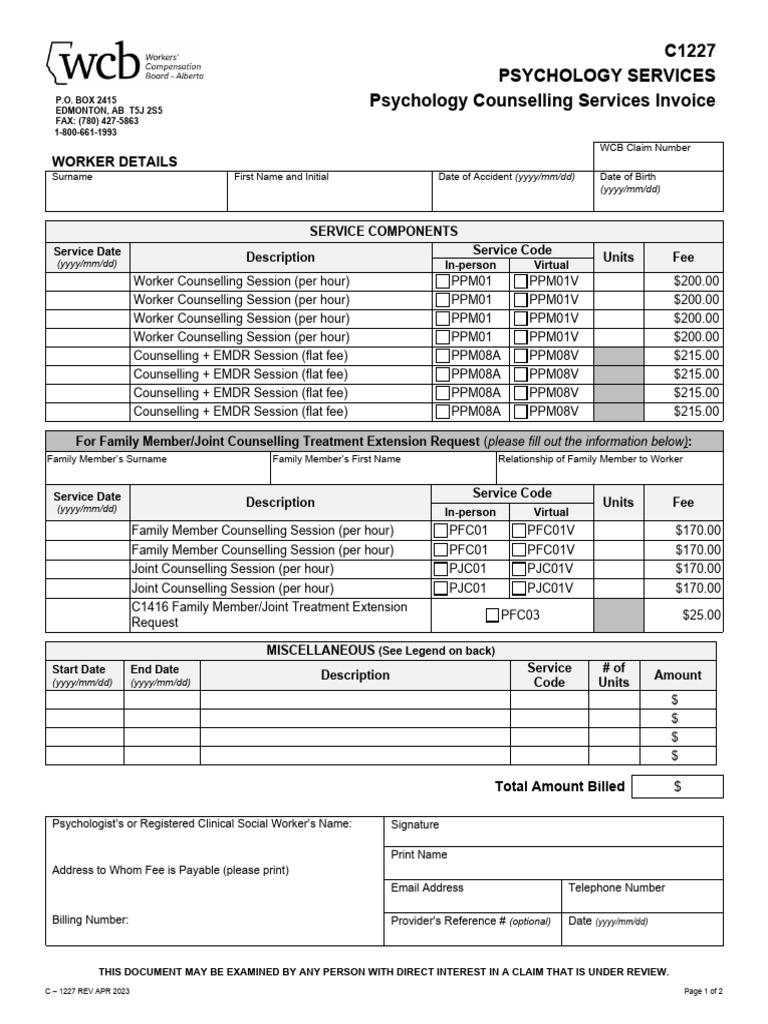 C1227 Psychology Services Psychology Counselling Services Invoice PDF