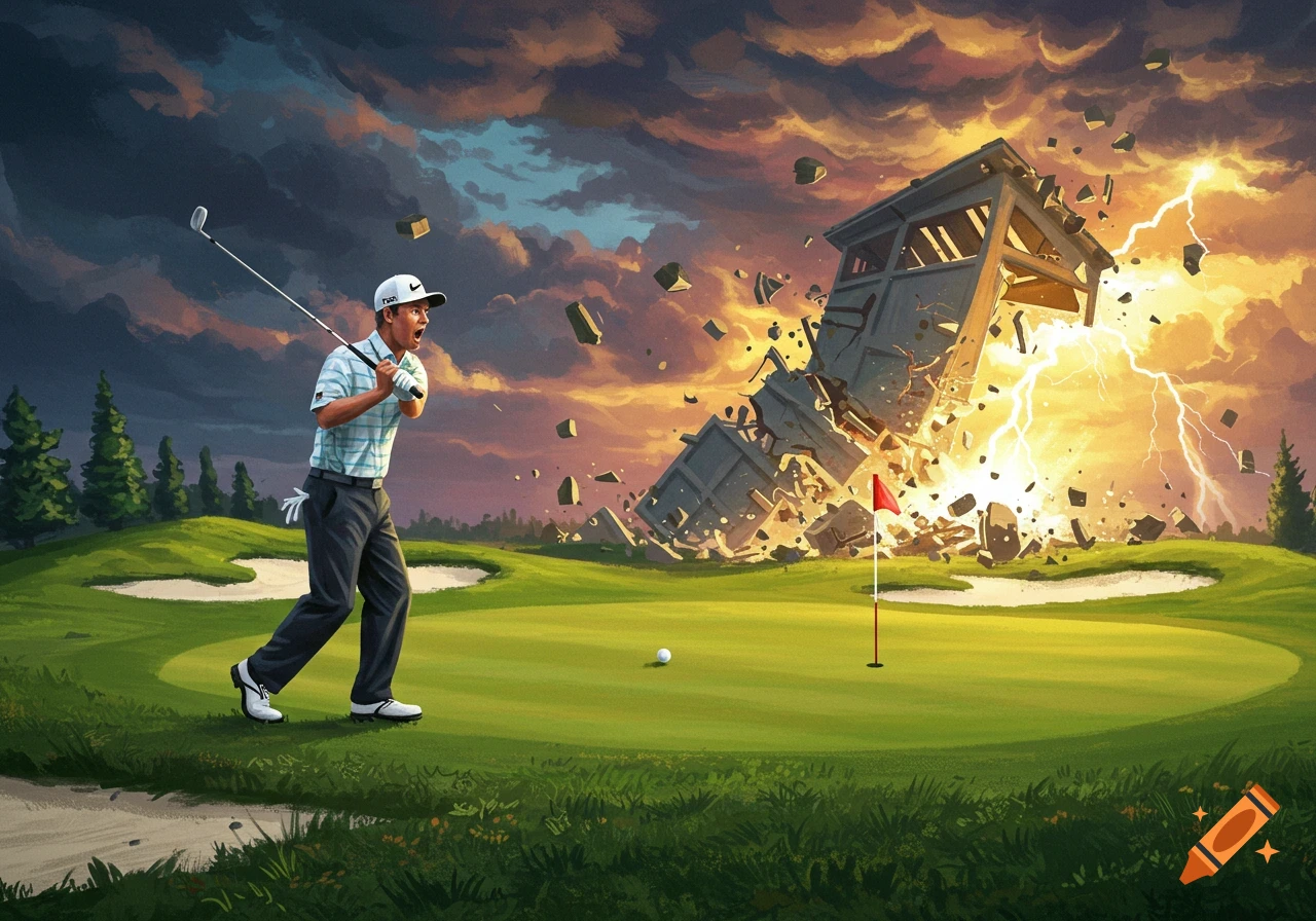 A golfer reacts as a structure explodes on a golf course under a stormy