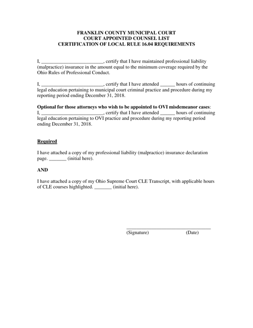 Franklin County Ohio Court Appointed Counsel List Certification of