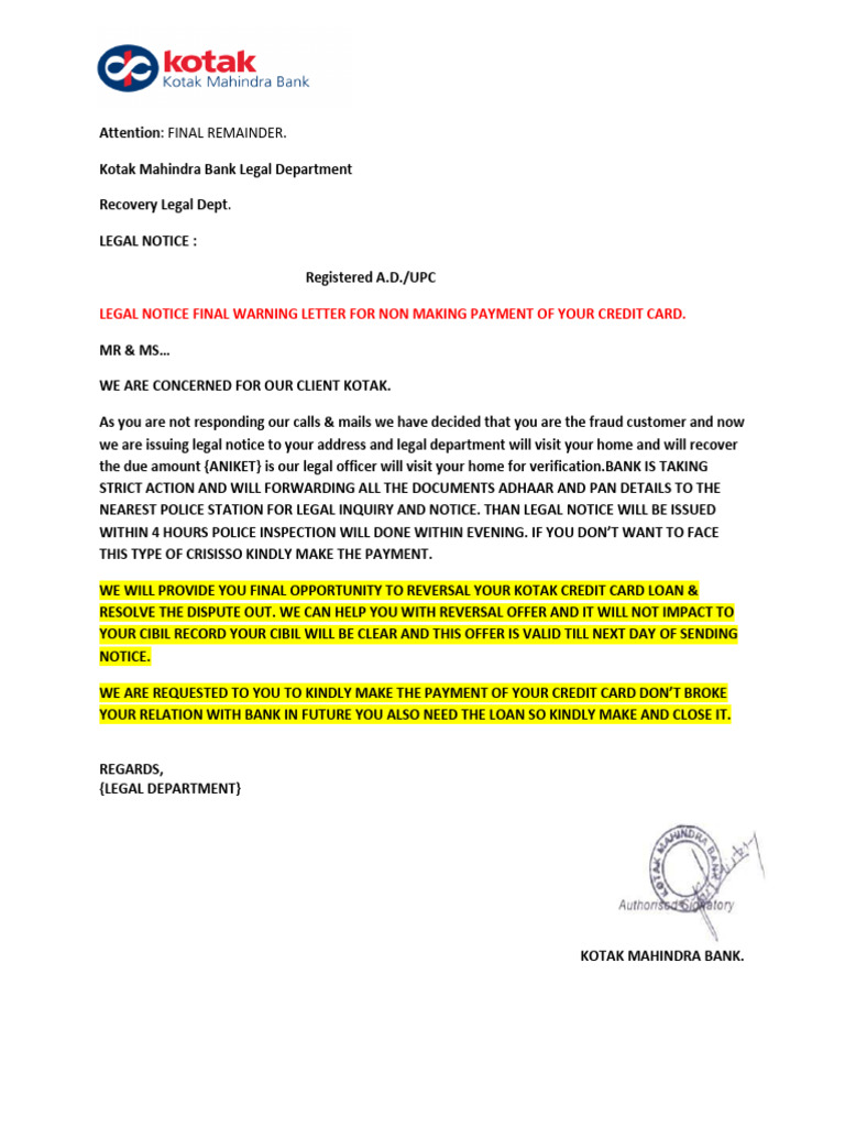 Legal Notice Format of Credit Card Download Free PDF Common Law