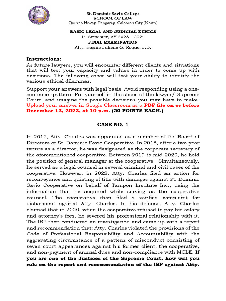 Final Examination Basic Legal and Judicial Ethics PDF Lawyer