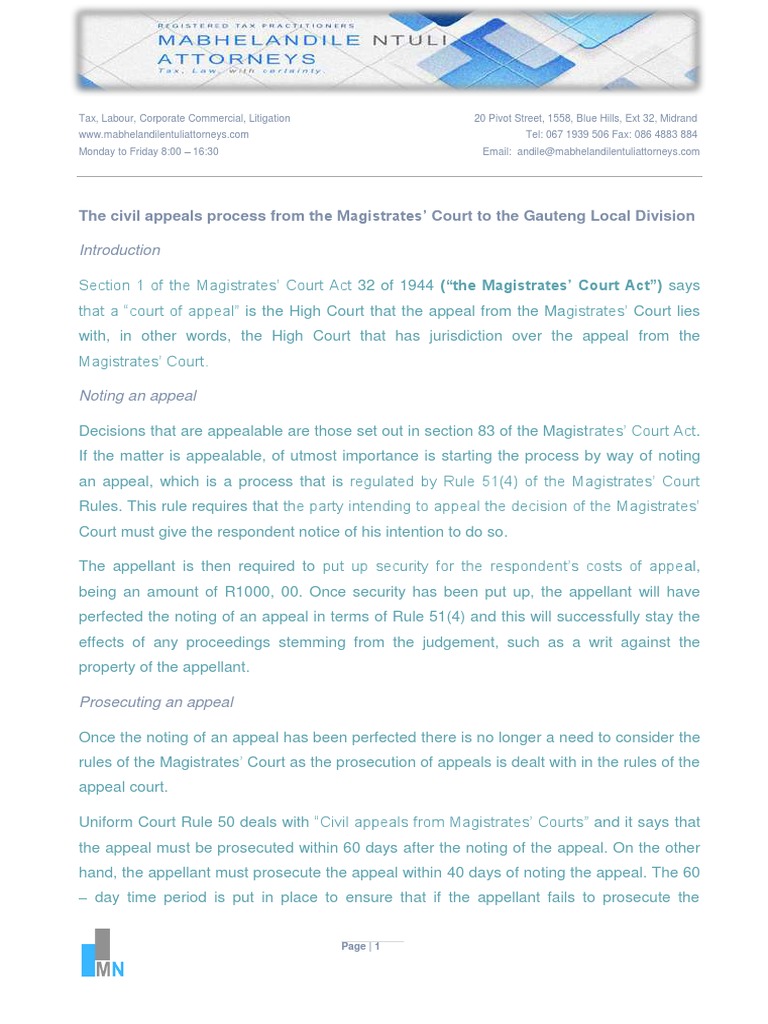 The Civil Appeals Process From The Magistrates #39 Court To The Gauteng