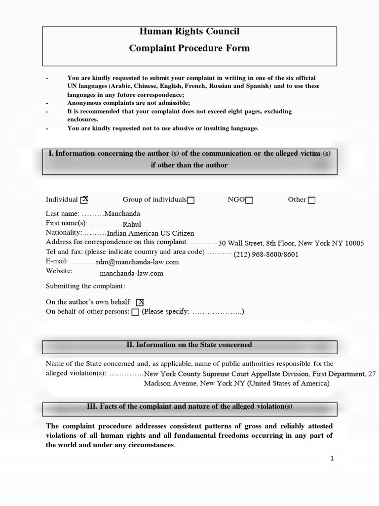 United Nations Commission On Human Rights Complaint Against NYS Supreme