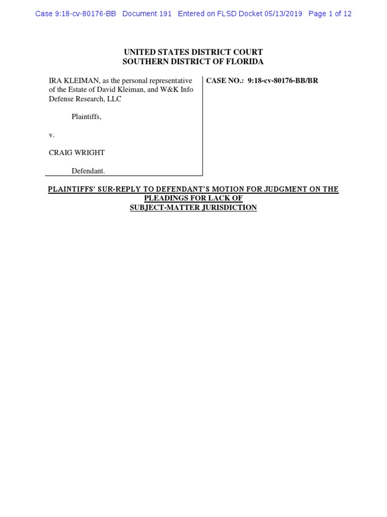 Kleiman Sur Reply On Motion For Judgement On The Pleadings For Lack of