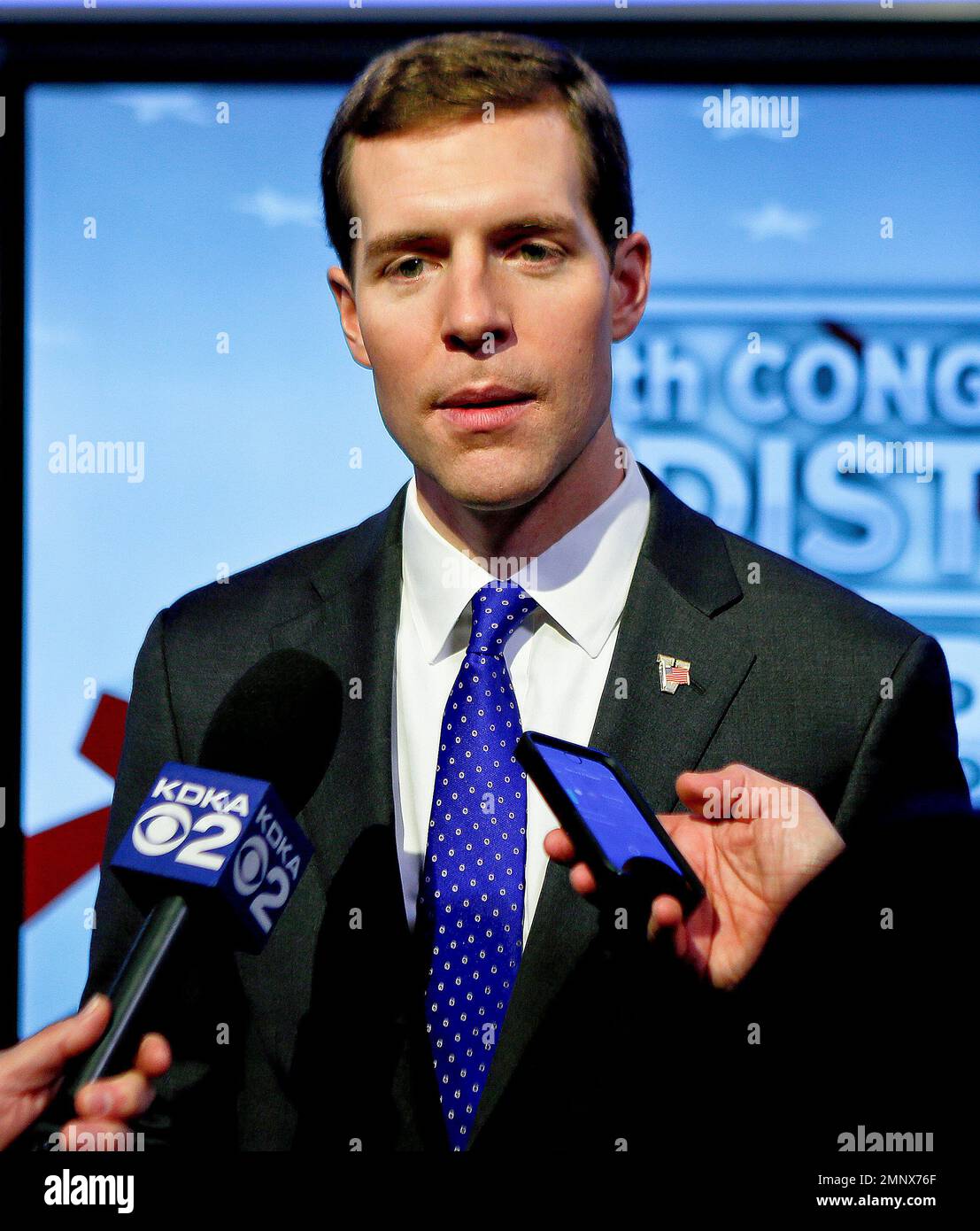 Democrat Conor Lamb talks with reporters after the taping of a debate
