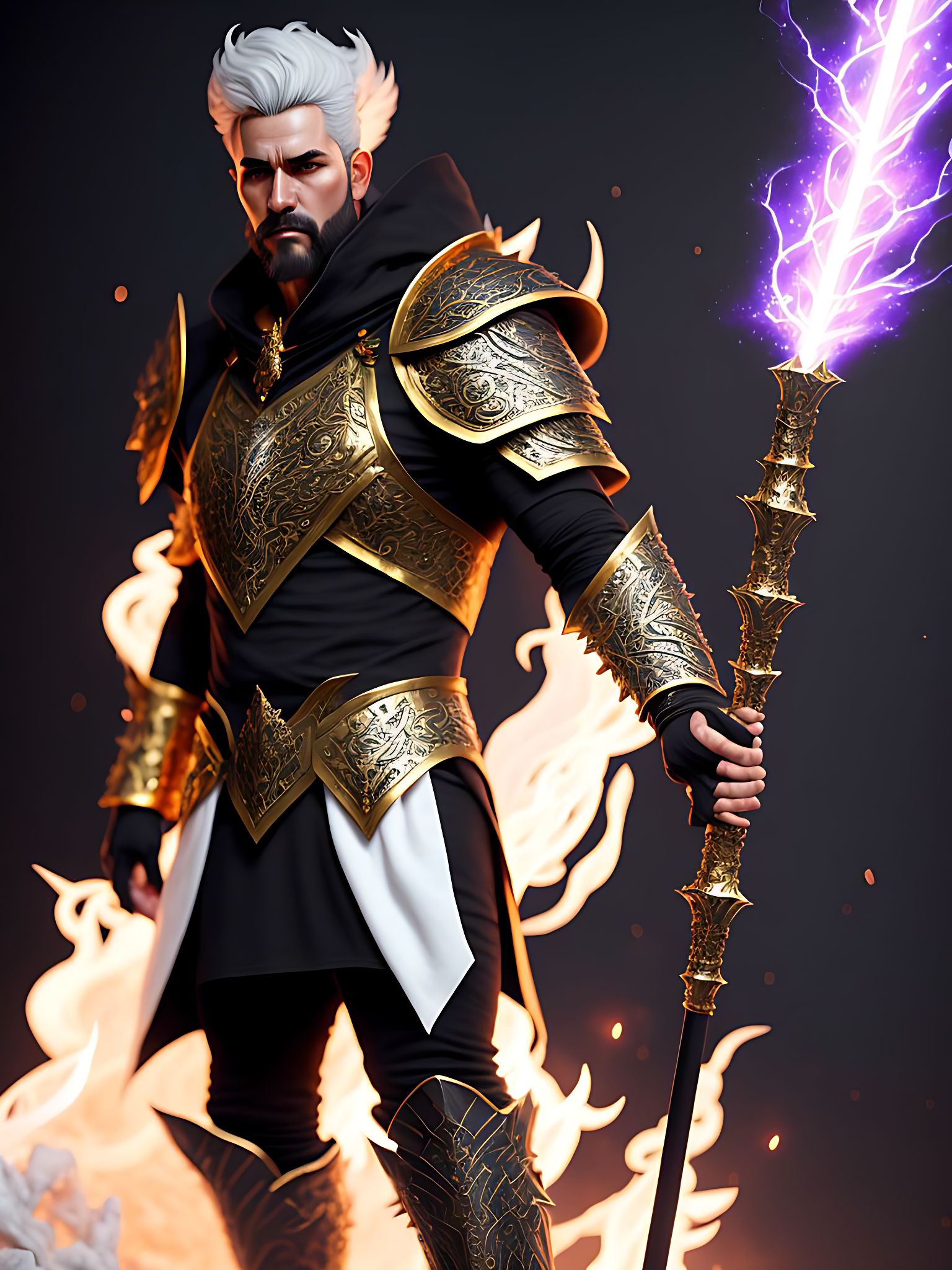 A sorcerer with a mysterious expression and a staff conjuring bolts of