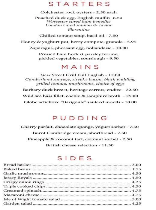Carta del pub y bar New Street Grill Londres 16A New Street