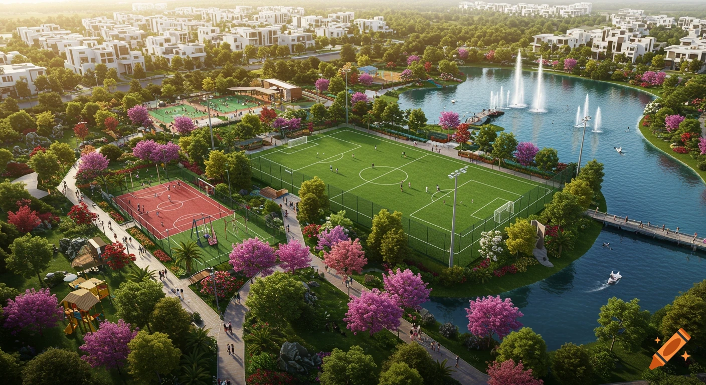 Aerial view of a park with soccer and basketball courts a lake with