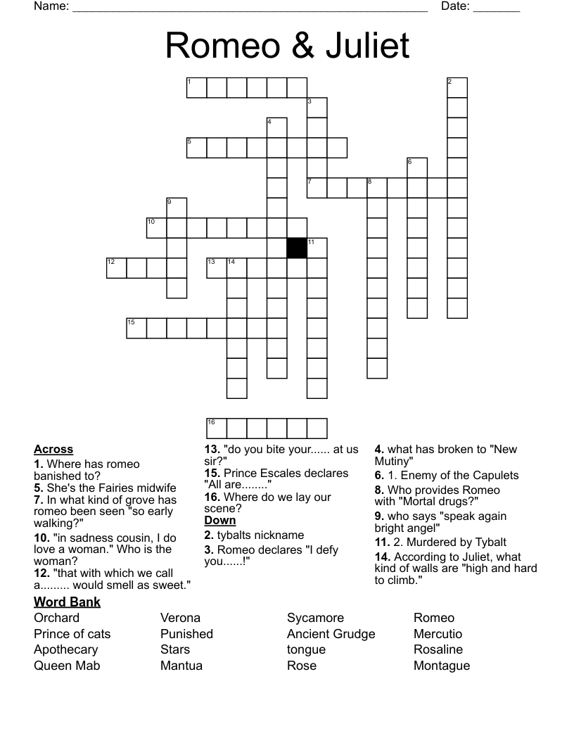 Romeo And Juliet Crossword Puzzle WordMint