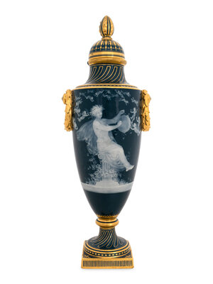 A Mintons Pâte sur Pâte Peacock Blue Ground Vase and Cover Lot 1127