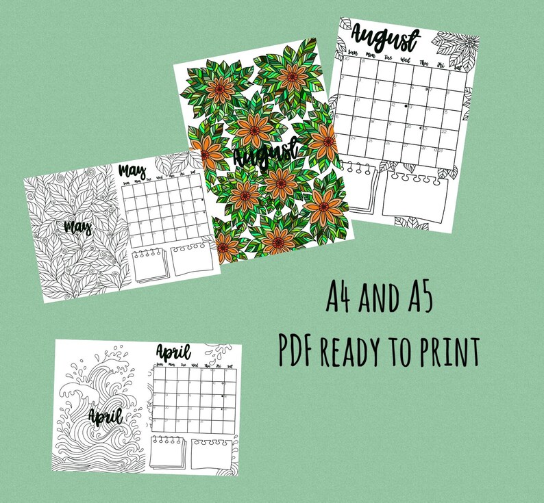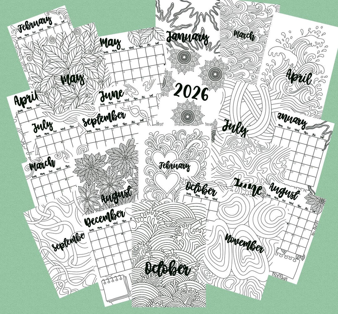 Colouring Calendar Bundle 2026 Cover Page Monthly Template Moon Phases