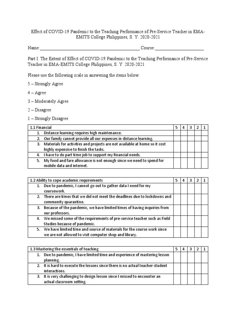Effect of COVID questionnaire Download Free PDF Teachers Learning
