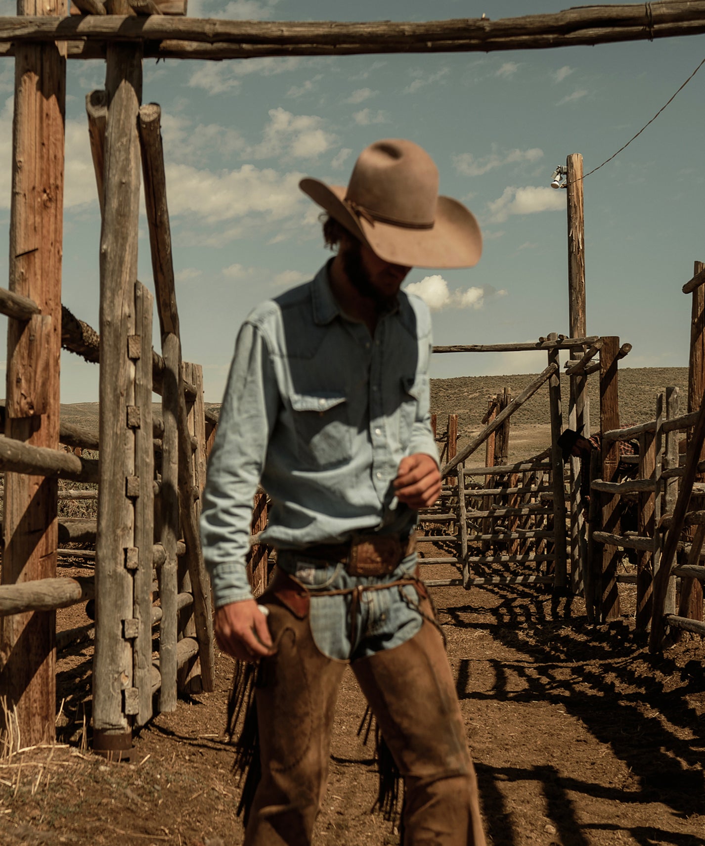 A cowboy in a leather vest and hat stands with his back to the camera