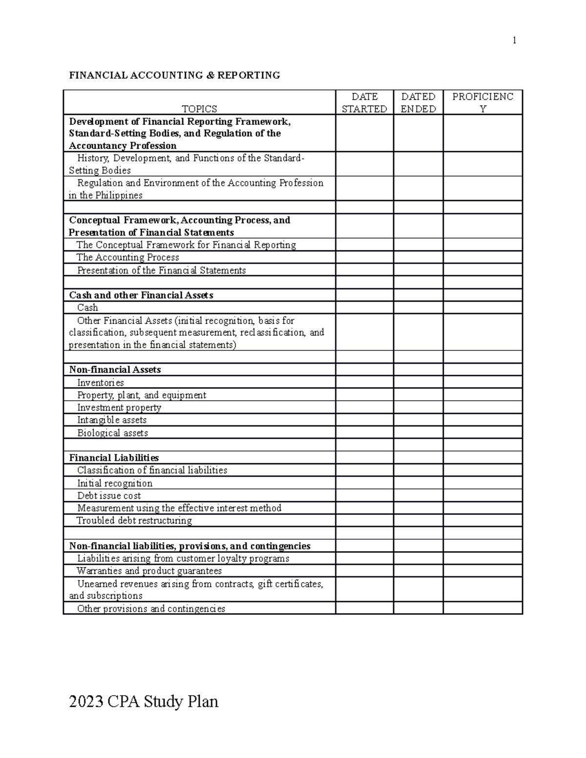 2023 CPA Study Plan FINANCIAL ACCOUNTING REPORTING TOPICS DATE