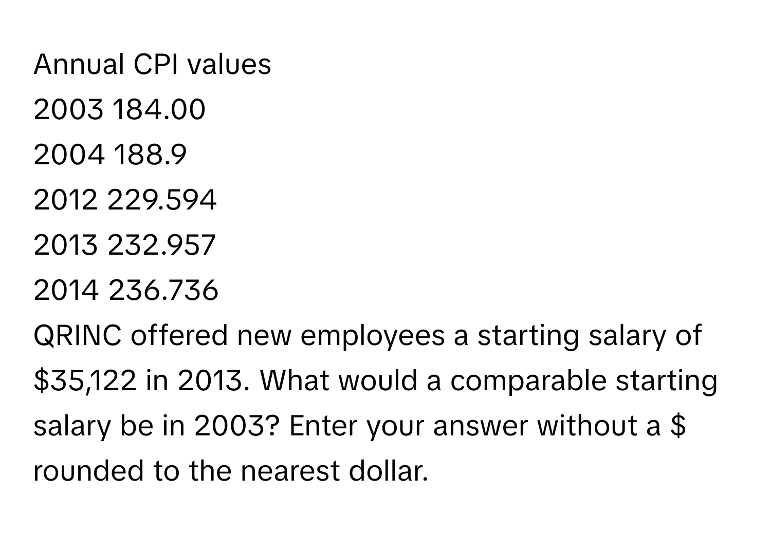 Solved: Annual CPI values 2003 184 00 2004 188 9 2012 229 594 2013 232
