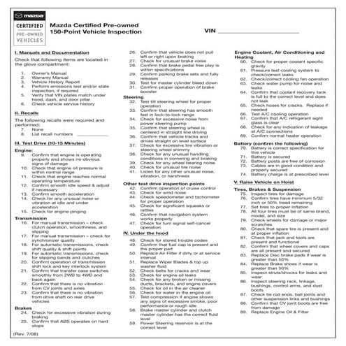 Mazda Certified Pre Owned (CPO) 150 Point Used Vehicle Inspection Check