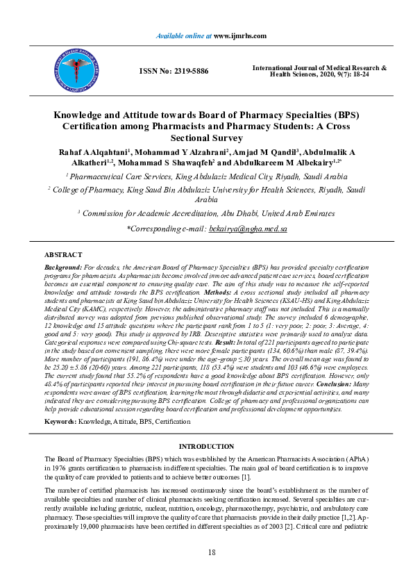 (PDF) Knowledge and Attitude towards Board of Pharmacy Specialties (BPS