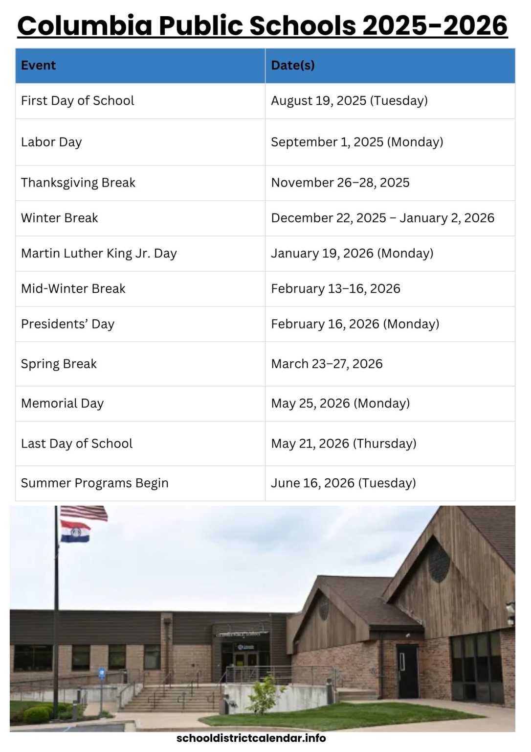 Columbia Public Schools Calendar with Holidays 2025 2026
