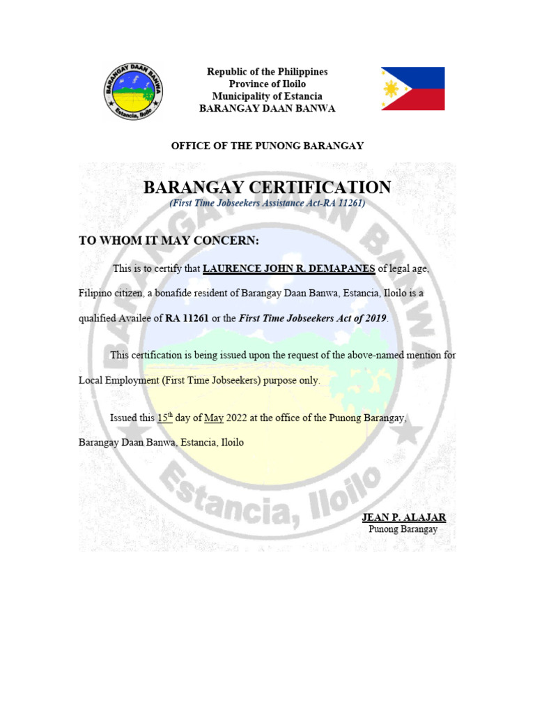 Barangay Certification (First Time Jobseekers) PDF