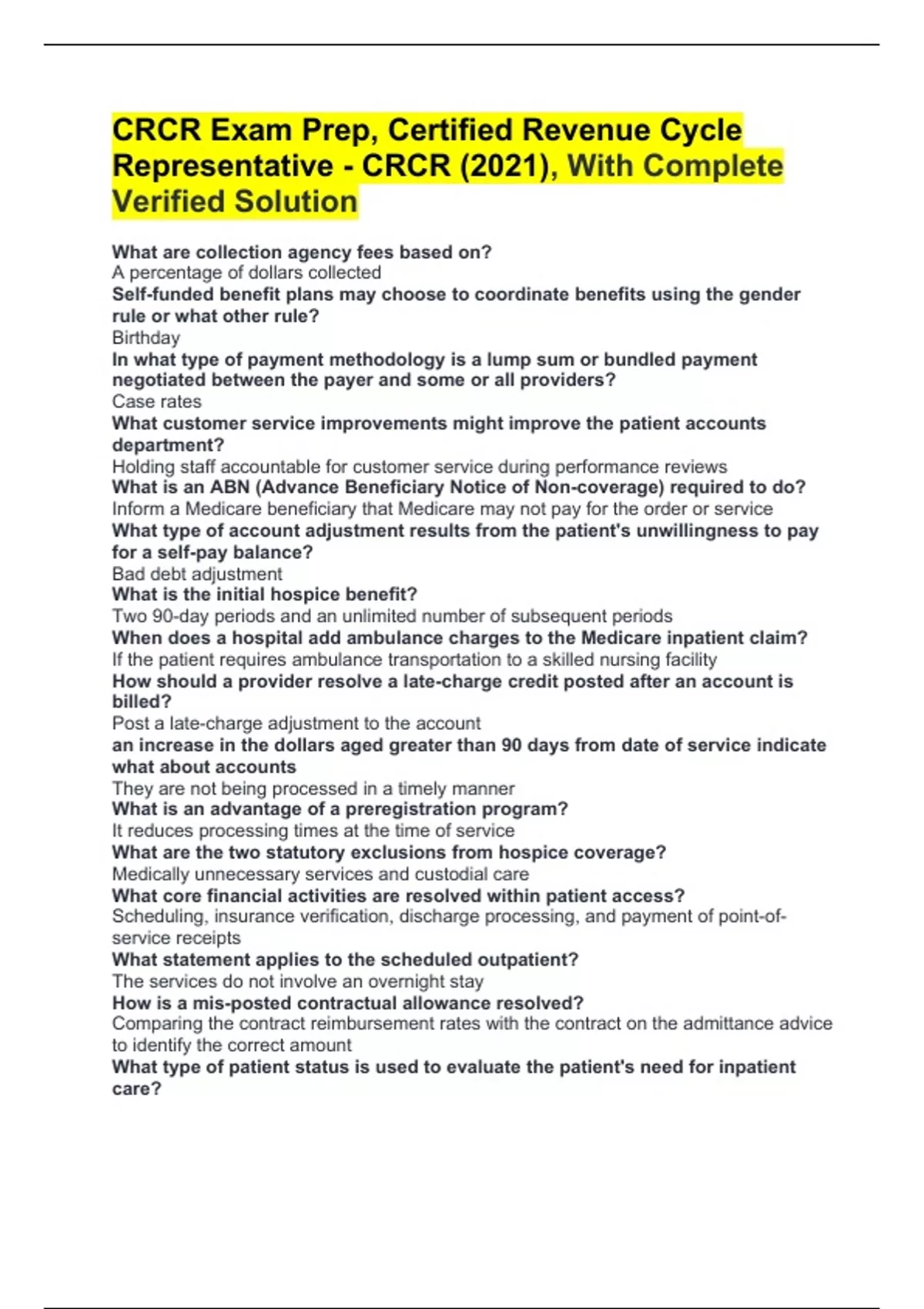 HFMA CRCR Test Questions and 100% Correct Answers/ HFMA CRCR Test