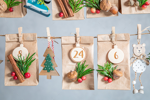 Creative Advent Calendar for Christmas as paper bag with clips Stock