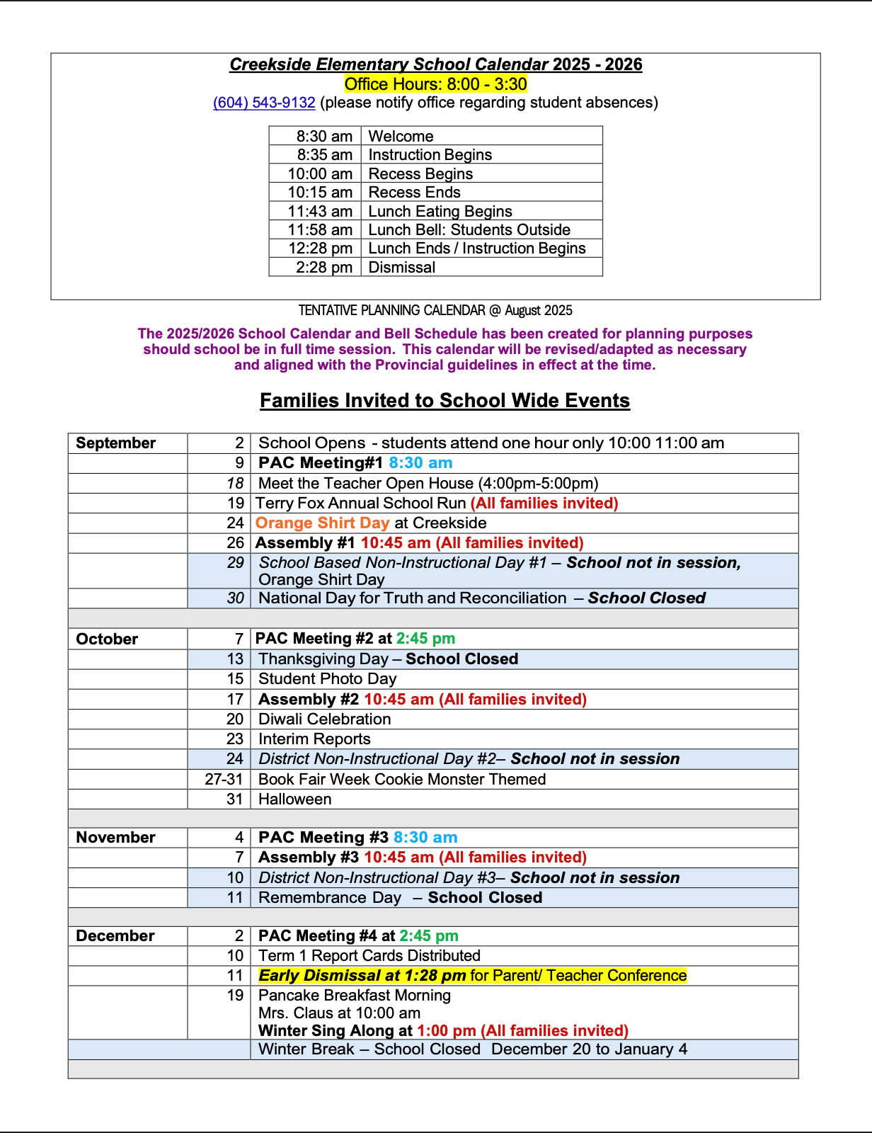 Creekside School Calendar 2025 2026 (updated)