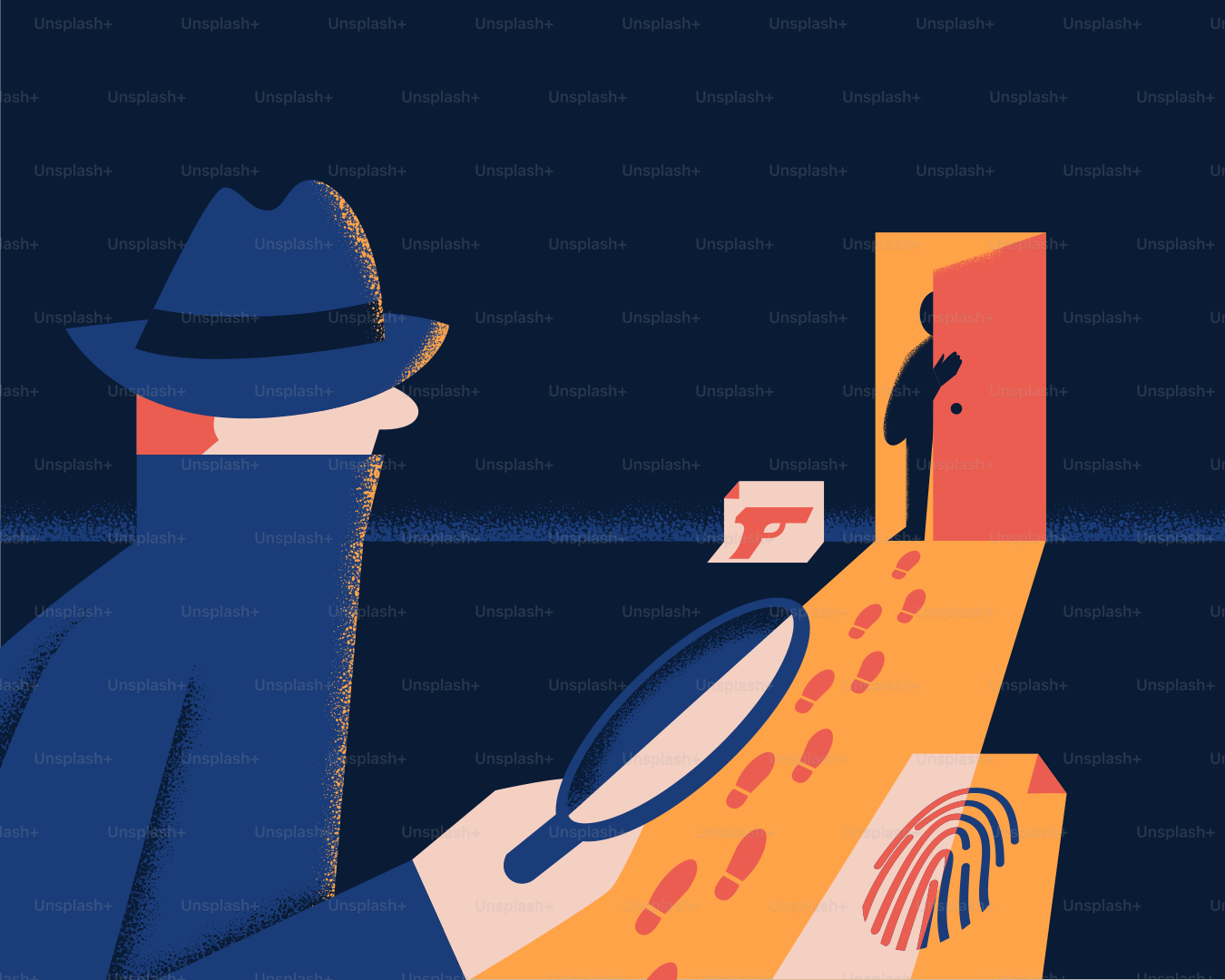 A man with a hat and a magnifying glass looking at a fingerprint vector