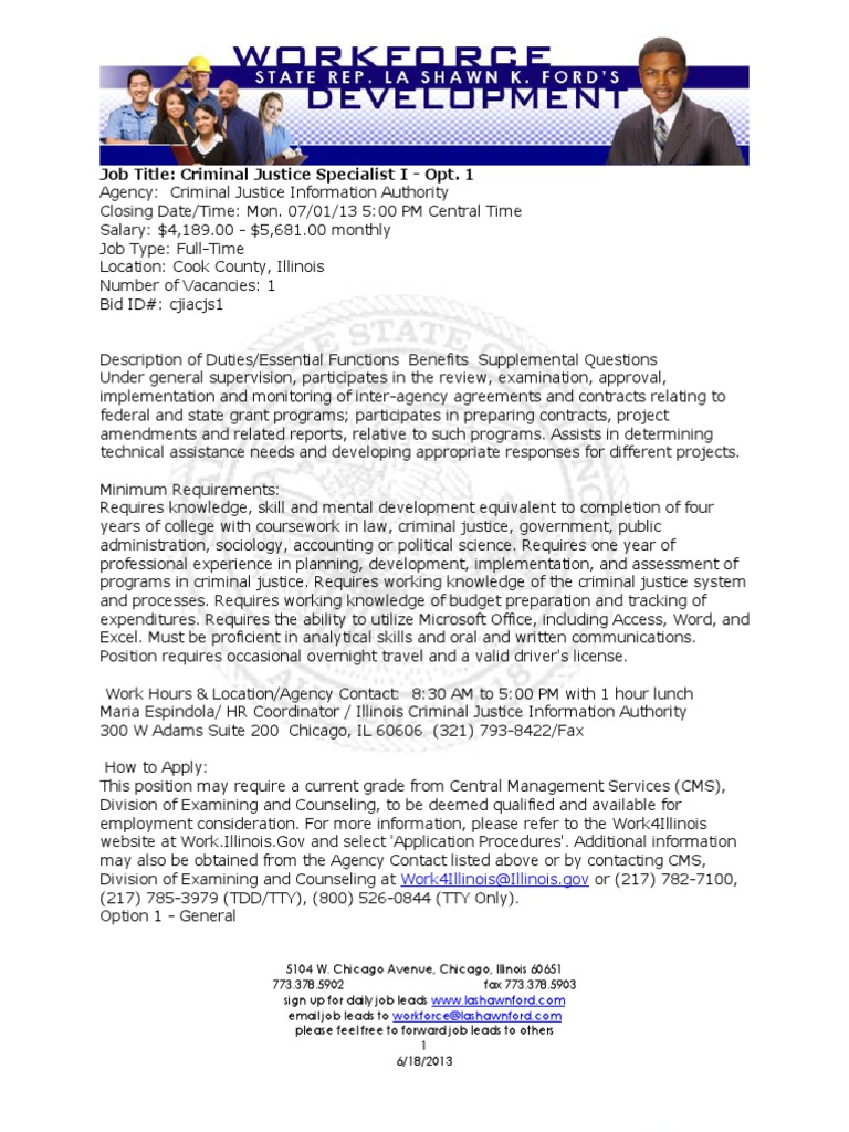 Job Title: Criminal Justice Specialist I Opt 1: Work4Illinois